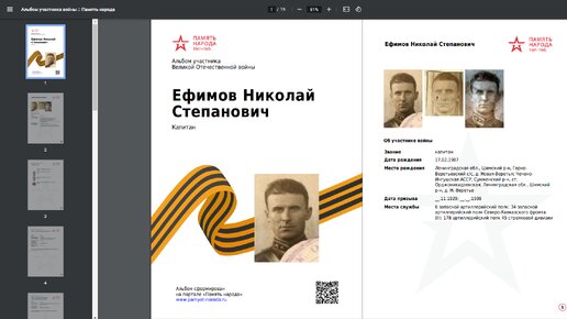 Относительно недавно появилась новая функция на сайте "Память народа" - создание альбома участника Великой Отечественной войны. Лично мне ее очень не хватало раньше. Теперь вы можете сформировать довольно симпатичный и информативный файл про вашего участника Великой Отечественной войны. Для создания Альбома вам понадобится проделать следующие шаги. В поиске найти вашего участника ВОв по ФИО: Далее переходим на страничку найденной персоны. В верхнем левом углу есть кнопка "Сформировать альбом": Нажимаем...