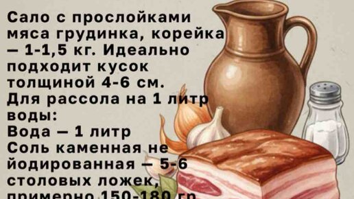 Горячий способ засолки сала — это быстрый, надежный и очень вкусный метод. Сало получается ароматным, нежным и готовым к употреблению уже через сутки. Этот способ хорош тем, что сало не просто солится, а варится в насыщенном ароматном рассоле, что придает ему особую консистенцию и позволяет храниться дольше. Список ингредиентов: Сало с прослойками мяса (грудинка, корейка) — 1-1,5 кг. Идеально подходит кусок толщиной 4-6 см. Для рассола (на 1 литр воды): Вода — 1 литр Соль каменная (не йодированная!) — 5-6 столовых ложек примерно 150-180 гр Лавровый лист — 3-5 шт...