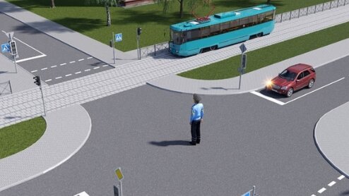 Как должен поступить водитель красного легкового автомобиля в показанной ситуации? Варианты ответов: а) уступить дорогу трамваю б) остановиться и ожидать другого (разрешающего движение) сигнала регулировщика в) пользуясь преимуществом, проехать перекресток первым Правильный ответ указан в конце статьи. Подумайте, прежде чем его смотреть. В показанной ситуации регулировщик, осуществляющий регулирование дорожного движения на перекрестке, обращен к водителям правым боком с опущенными руками. При...
