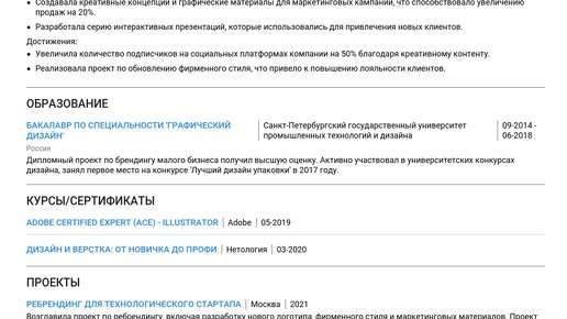 Пример резюме креативного графического дизайнера поможет вам создать действительно эффективный документ. Изучите готовые примеры, чтобы быстрее получить работу мечты в этой востребованной сфере. ✨ На этой странице вы найдете подробные пошаговые руководства по составлению каждого раздела резюме, от контактов до навыков. Мы собрали актуальные готовые примеры резюме креативного графического дизайнера для начинающих и опытных специалистов, учитывая требования работодателей и ключевые навыки. Изучив пример, вы сможете создать резюме с помощью нашего конструктора резюме...