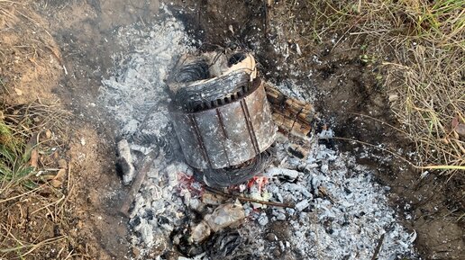 Обжиг электродвигателя на костре и его разделка, чтобы достать медь, которую сдал в металлоприемку. Движки бросили военные.