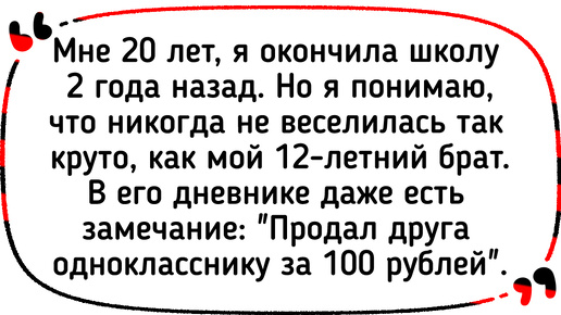 Ученые давно выяснили, что смех не только продлевает жизнь, но и снижает риск многих заболеваний. За новой порцией забавных историй, способных вызвать улыбку, не нужно идти в аптеку. Ведь мы уже собрали самые свежие из них в этой подборке. ADME предлагает вашему вниманию 9 историй, которые прогонят хмурое настроение и, возможно, вызовут самый искренний смех. Забудьте о проблемах хоть на 5 минут. Насладитесь моментом! Мне 20 лет, и я окончила школу 2 года назад. Но я понимаю, что никогда не веселилась так круто, как мой 12-летний брат...