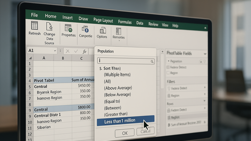 Сводные таблицы Excel — это мощный инструмент анализа, но без правильной фильтрации они превращаются в громоздкий массив информации. В этой статье мы пошагово разберём, как с помощью простой кнопки фильтрации можно мгновенно превратить огромную таблицу в понятный и наглядный отчёт. Начнём! 💪 Фильтрация в сводной таблице позволяет сосредоточиться только на нужной информации. Вы можете временно скрыть лишние строки и отображать только те данные, которые соответствуют определённым критериям — например, регионы с численностью менее одного миллиона...