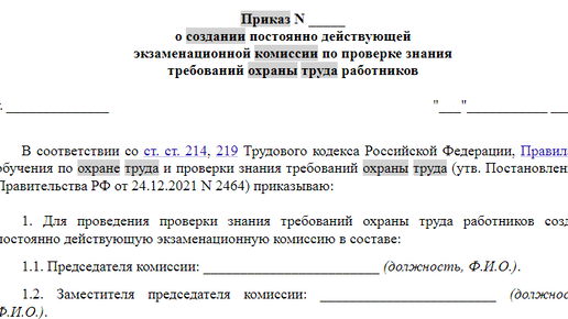Приказ о создании комиссии по охране труда - образец