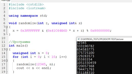 Почти во всех языках программирования имеются встроенные функции для генерации случайных чисел. И, конечно же, именно их и следует использовать. Однако уверен, что кому-то наверняка будет любопытно попробовать создать такой генератор самостоятельно. К тому же он может пригодиться в языках, где встроенных функций генерации случайных чисел нет (например, их нет в языках программирования ПЛК). Итак, вот вам пример такой функции на С++: void randomize(int z, unsigned int& x) { x = 0x3FFFFFFF & (0x41C64E6D...