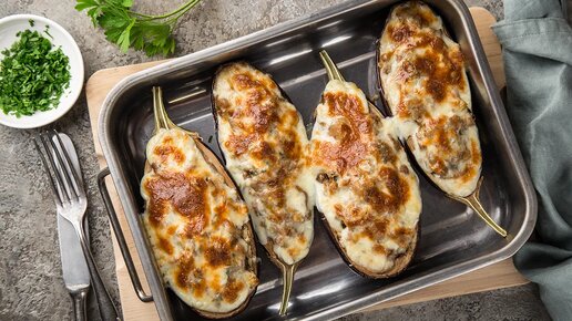 Готовлю баклажаны в духовке и подаю с начинкой из сыра, сухарей, приправы и овощей (показываю рецепт приготовления)