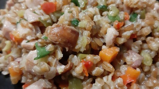 Рецепт булгура с копчёной курицей, овощами и маринованными огурцами