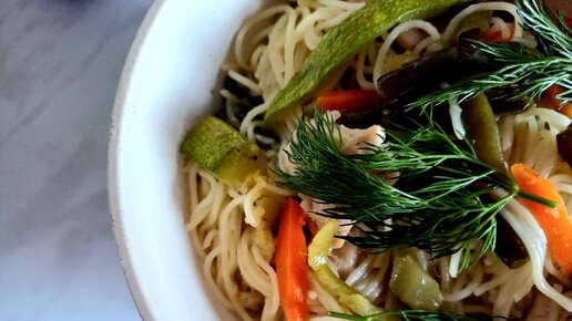 В этом рецепте хочу поделиться с вами любимым рецептом приготовления спагетти🍝. Лапшой вок я не могу назвать это блюдо, так как для приготовления я использую обычную сковороду. Когда-то в далёком 2014 году мы с мужем попробовали в первый раз лапшу Вок. Нам очень она понравилась и я решила приготовить её дома чисто интуитивно и получилось в разы вкуснее и менее жирно. Теперь готовлю её регулярно! Это отличный вариант полноценного обеда, для кого-то ещё и ужина🤫 По этому рецепту я готовлю как лапшу (гречневую или яичную), так и обычные спагетти...