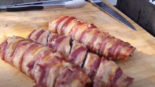 Совсем немногие люди, готовя шашлык на мангале, используют фольгу, что совершенно напрасно. Фольга позволяет не только приготовить особенно сочное и нежное мясо, но и разнообразить рецепты приготовления шашлыка, добавив к мясу овощи, гарниры и прочие продукты. Приготовим очень интересный шашлык в фольге. Блюдо получится необычным, сочным и вкусным. Итак, возьмем фольгу, разрежем ее на куски – по одному листу для каждого шампура. На лист фольги выкладываем тонкие ломтики бекона. Выкладываем их ровным сплошным слоем, по длине чуть больше длины куска мяса...