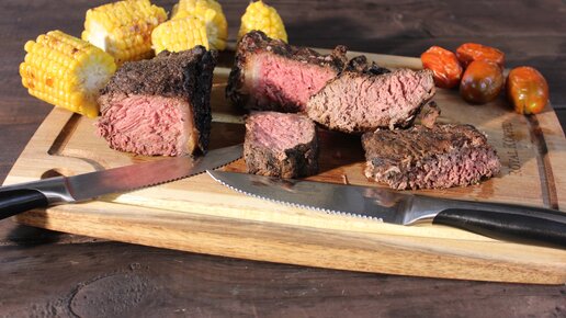 Как правильно приготовить СТЕЙК из говядины на гриле. СТРИПЛОЙН с кофейным вкусом. Для многих стейк - это курятина, свинина , баранина, обжаренная на сковороде или углях. Мы сегодня приготовим говядину- сочную , с насыщенным вкусом. Всё остальное попытки заменить мраморное мясо. Кстати как получают мраморное мясо? Бычков кормят досыта 6 месяцев . Устраивают пир . Например prime- это настоящий эталон , из которого получаются отличные стейки. Вот мы купили говядину , а дальше что? Нужно её правильно нарезать...