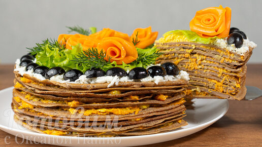 Этот невероятный закусочный торт из печени украсит любой ваш праздник. А главное — готовится он из самых простых доступных каждому продуктов. В этом рецепте предлагаю свой вариант приготовления и оформления печеночного торта для праздника. В нем нежные блинчики из печени чередуются с ароматной начинкой из пассированных овощей, а цветочное оформление радует глаз. Такая закуска точно не останется без внимания!