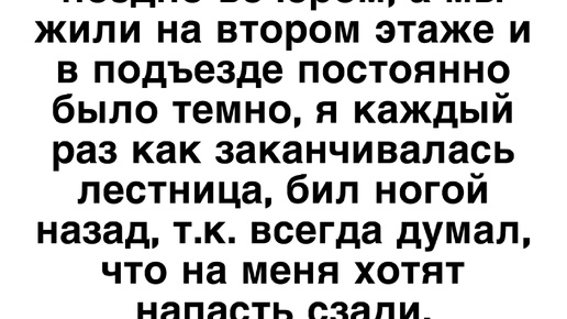 Смешные истории из жизни Когда жил с родителями, то возвращаясь домой поздно вечером, а мы жили на втором этаже и в подъезде постоянно было темно, я каждый раз как заканчивалась лестница, бил ногой назад, т.к. всегда думал, что на меня хотят напасть сзади. Смешные истории из жизни Активно худею после родов. Стараюсь понемногу, часто занимаюсь спортом, поэтому, когда вызываю лифт на первый этаж, сама бегу наверх, стараясь его опередить. Сегодня побила свой рекорд, но радовалась недолго, так как на первом этаже осталась коляска с ребенком и недоумевающий сосед из лифта...