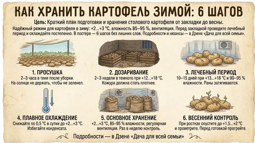 Коротко по делу. Для продовольственного картофеля лучший режим хранения зимой в погребе такой: температура +2…+3 °C, влажность 85-95 %, обязательная вентиляция. До закладки выдерживаем лечебный период 10-15 дней при +13…+18 °C, затем охлаждаем плавно, не больше чем по 0,5 °C в сутки. В таких условиях срок хранения картофеля достигает 8-12 месяцев без прорастания и гнили. Когда в ноябре в погребе впервые «схватывает» сырость и слышно, как по крышке ящика тихо капает конденсат, это верный знак, что мы поспешили с охлаждением или забыли проветрить...