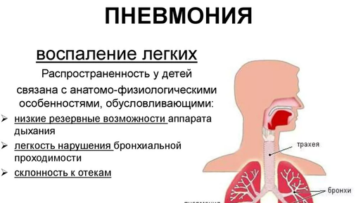 Пневмония (воспаление лёгких) – заболевание инфекционное и очень тяжёлое, которое требует хорошей диагностики и срочного лечения. Чтобы не спутать пневмонию с такими болезнями, как простуда и бронхит, следует знать симптомы: 1. Одышка (ткани лёгких поражены); 2. Температура высокая и долго держится (интоксикация организма); 3. Кашель (возможно выделение мокроты ржавого цвета); 4. Боль в области груди (сбоку); 5. Состояние тяжёлое, либо среднее. Точный диагноз должны поставить врачи, обследуя пациента (радиография лёгких, перкуссия и аускультация)...