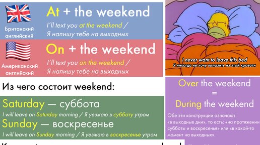 Мы решили, что пора наконец разобраться с тонкостями английского, связанными с нашим (и, вероятнее всего, вашим тоже) любым явлением — выходными. Специально для вас мы сделали полезную карточку, в которой есть все: объяснение, в чем заключается разница между at the weekend и on the weekend, демонстрация ситуаций, в которых предлоги at и on вам точно не понадобятся при разговоре о выходных на английском и еще много всякой всячины, включая наглядную инструкцию от Гомера Симпсона о том, как надо проводить идеальные выходные...