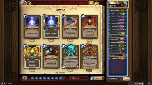 Всем привет. Сегодня сыграем на токен друиде из дополнения "Возмездия теней". Очень агрессивная колода с сильным проспамом стола, которая быстро забирает стол и уже не отдает его. Муллиган зависит от соперника, но почти всегда в стартовой руке мы хотим видеть "Лесные огоньки" с баффом(оптимально с "Силой Дикой природы". Стиль игры колоды так же зависит от противника, поэтому иногда мы играем от стола, грамотно разменивая вражеских существ, подготавливая стол под пробафф и финиш с Диким Ревом, а иногда мы с самого начала стараемся каждую единицу урона нанести в лицо оппонента...