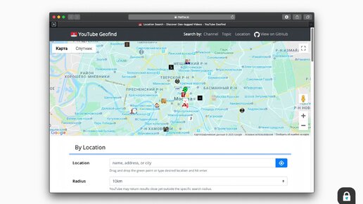 У авторов видео на YouTube есть возможность отметить место съемки на карте. Однако, в самом YouTube поиск по геолокации выполнен крайне неудобно. Если вам нужен более точный поиск видео по геолокации — воспользуйтесь этим сервисом. Отметьте точку на карте и выберите радиус поиска в километрах. После нажатия на "Search" на карте сверху отобразятся все видео, которые помечены в этой области, а снизу — ссылки на них...
