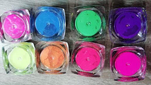 Всем добрый день! Сегодня я хочу вам рассказать про неоновые пигменты. Так что же это такое? Это такой порошок в состав которого входят красители, они светятся в ультрафиолете. Отсюда и название. Как видно на фото продаются они в маленьких баночках, но того количества хватит на долго, так как расход минимален. Эти пигменты очень ярких, насыщенных цветов. Использую их в работе с гель-лаками. Замешиваю в небольшом количестве базы или топа, получается гель-лак того цвета, что и пигмент. Так же их можно смешивать между собой и делать цвет который вам нужен...