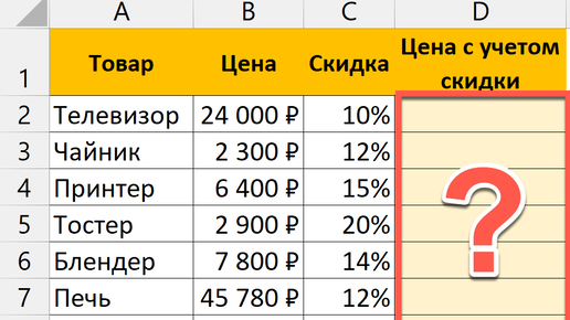 Многие рассчитывают стоимость товаров или услуг с учетом скидок и часто задают мне вопрос: "Как вычесть процент из числа в Excel"? Все просто! Например, в столбце D рассчитаем цену на товар с учетом скидки из столбца С...