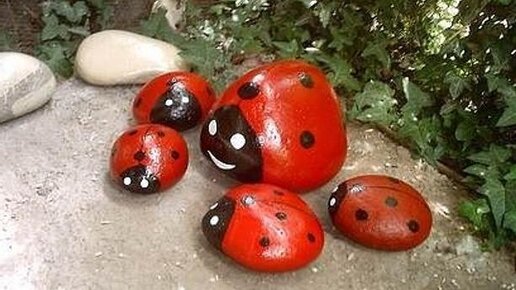 Поселите в своём саду ярких и весёлых божьих коровок! А сделать их не сложно - понадобится всего пару вечеров. Или можно заняться этим увлекательным делом в выходной день прямо на даче. Привлеките к этому занятному делу своих детей - они будут в восторге! Берём обычные круглые камни - морскую гальку, можно разных размеров. Поселим в саду целое семейство этих милых букашек. Можно стащить несколько камней-голышей из котла в бане. (Я так и сделала)) * Камни хорошо моем и просушиваем. * Готовим красную и чёрную краску...