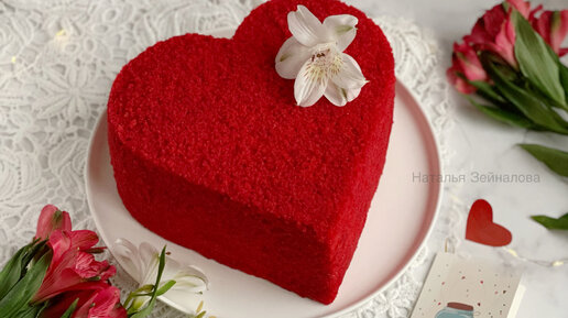 Очень просто готовится, получается вкусный и нежный торт, даже пропитку не надо. А превращение круглого торта в «сердечный» по желанию)) В конце статьи будет видео по сборке. Ингредиенты: Для коржей (d18 см.) Крем: Сначала смешиваем все сухие ингредиенты, затем добавляем яйца, масло, кефир и краситель, и взбиваем миксером до однородности. Оставляем на 20-30 минут, чтобы сода и кефир вступили в реакцию. Форму (18 см) смазываем маслом, на дно укладываем пергамент. Тесто визуально или с помощью весов делим пополам и выпекаем два бисквита при 170° градусах около 20 минут, до сухой соломинки...