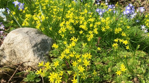 Как Вы уже поняли, речь в статье пойдет про луковичное раннее растение - Гусиный лук желтый. Когда я вижу эти веселые желтые цветочки, вспоминается шутка : "Стоит только взять протянуть к ней руку... а на шею она тебе сама сядет.:))". И хоть это было сказано вовсе не про цветы, но по смыслу очень подходит. Потому что гусиный лук в моем саду - это очередной милый ... сорняк. К которому я 12 лет назад протянула руку:) То есть привезла небольшой пучок вместе с клубнями из леса. Ну а потом... Как говорится :"Ни слова больше:))", ни малейшего ухода или усилий...