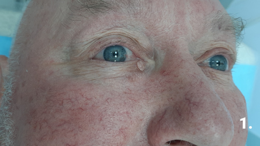 Добрый вечер, друзья! С вами снова на связи доктор Александр Карпунин! Сегодня расскажу о том, как проходило лечение опухоли кожи века. Пациент пришёл на консультацию с целью избавиться от опухолевидного образования на поверхности кожи нижнего века правого глаза, которое появилось несколько месяцев назад без видимой причины в виде маленького бугорка и стало постепенно увеличиваться, достигло размера 5 мм., что и заставило пациента обратиться к врачу (фото 1). Хорошо видно образование внутренней части нижнего века правого глаза, возвышающееся над окружающей кожей...