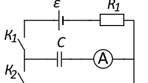 В схеме, изображенной на рисунке, в начальный момент времени ключи К1 и К2 разомкнуты, а конденсатор С (большой емкости) не заряжен. Через некоторое время после замыкания ключа К1 амперметр А показывает величину тока I1 = 1 мкА. В этот момент замыкают ключ К2. Какую величину силы тока покажет амперметр сразу после замыканию ключа К2, если известно, что R2 = 2·R1 = 100 МОм, а ЭДС батареи Е = 100 В? Внутренними сопротивлениями амперметра и батареи пренебречь. Схема находится в двух состояниях. 1. Замкнут ключ К1, а ключ К2 разомкнут...