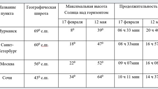Используя данные таблицы, выявите закономерности изменения продолжительности дня и высоты Солнца над горизонтом в зависимости от географической широты и времени года на территории России. 1. Сравните положение указанных в таблице городов по отношению к экватору. 2. Сравните высоту Солнца над горизонтом в указанных городах в летнее и в зимнее время. 3. Сравните продолжительность дня в указанных городах в летнее и в зимнее время...