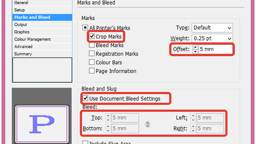 Заранее настроив в документе выпуск за обрез, открываем окно...