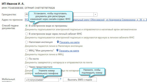 Подтверждение номера телефона и электронной почты при внесении изменений в ЕГРЮЛ и ЕГРИП в 1С:Бухгалтерия 8