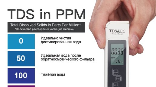 Что такое ЕС (PPM)? Этот показатель указывает количество (концентрацию) растворенных солей в измеряемой жидкости (TDS – Total Dissolved Solids — количество растворённых солей). Измеряется это общее солесодержание TDS в разных единицах – ЕС или PPM (это просто разные шкалы измерения одного и того же, как градусы Цельсия и градусы Фаренгейта для измерения температуры, к примеру). PPM – единица минерализации (количество частиц солей, растворенных в 1 миллионе частиц воды), ЕС – электропроводимость (измеряется в миллисименсах на см, мС/см)...
