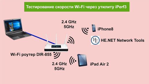 В данной статье хочу рассказать как узнать на какой скорости по Wi-Fi работают ваши беспроводные устройства: смартфоны, планшеты, ноутбуки. Как все мы знаем у каждого из нас сейчас дома есть Wi-Fi роутер. Или не у каждого, но есть. К нему по беспроводной сети подключаются ноутбуки, планшеты, смартфоны. Для того, чтобы узнать на какой скорости работают наши устройства мы будем использовать утилиту iPerf3. Рассмотрим нашу схему тестирования. Рисунок 1. К роутеру по кабелю подключен ноутбук на скорости 1 GBit/s...