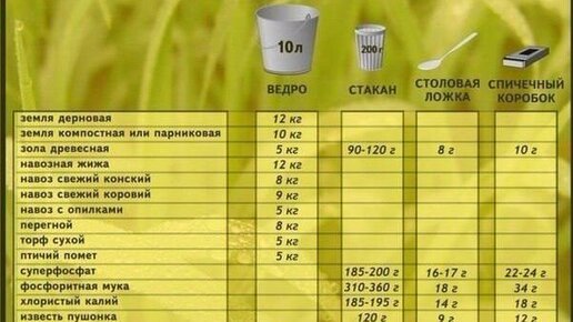 Что бы взвесить необходимое количество удобрений, не обязательно пользоваться весами. С помощью нашей таблицы вы легко отмерите нужный вес хим. препаратов и органики. Для этого, весы Вам иметь совсем необязательно...