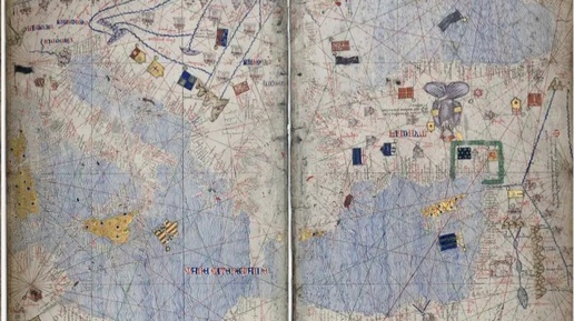 Атлас XIV века, приписываемый Аврааму Крескесу. Через Wikimedia Commons. Атлас, подаренный в 1380 году королю Франции Карлу V, содержит подробное изображение известного мира от Атлантики до Китая. Выделенный здесь фрагмент посвящен Восточному Средиземноморью и Черному морю. Крупные портовые города, через которые осуществлялась торговля зерном на дальние расстояния, такие как Генуя, Венеция, Мессина, а также Каффа и Тана, отмечены флагами, что подчёркивает их стратегическое экономическое значение...