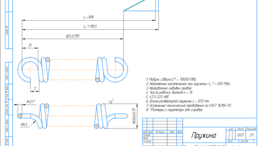 Пружина растяжения имеет: наружный диаметр 20 мм, диаметр проволоки 3,5 мм, ход 26 мм, силу при рабочей деформации 56 кг, длину без зацепов при рабочей деформации 82 мм, число рабочих витков 15, зацепы из полного витка выведенные на центр...