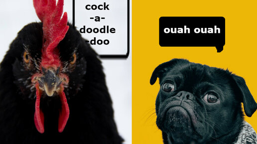 Вот вопрос: где слова “baraag,” “toot,” “toerroe,” “baaa,” “paoh-paoh" и “у-у-у” означают одно и то же? В мире животных! Это все звуки, которые издаёт слон, когда трубит, соответсвенно на английском, финском, немецком, итальянском, японском и русском. И такая чехарда со звуками происходит не только у слона. Например, в русском языке мышь пищит, только вот на английском мышь пищит так: squeak, а на немецком так: piep-piep, а японские мышки пищат так: chu chu. В русском языке собаки гавкаю...