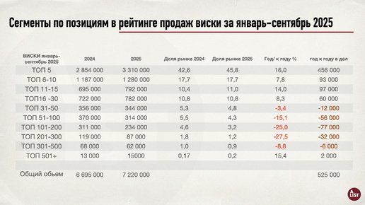 Рынок виски по итогам 9 месяцев 2025 года показывает рост продаж в +7.8%. Что и неплохо, если не задавать лишних вопросов. Но если посмотреть, что именно растет и как — картина вырисовывается безрадостная. Красивых разговоров о хересных бочках и торфяных нотах сегодня не будет. Есть только голый факт: российский рынок с пугающей скоростью превращает виски в «третью водочную категорию», следуя по стопам «девальвированного» коньяка. Это больше не про вкус. Это про логистику и скорость розлива. Первая иллюзия, с которой надо распрощаться, — это иллюзия роста категории и выбора...