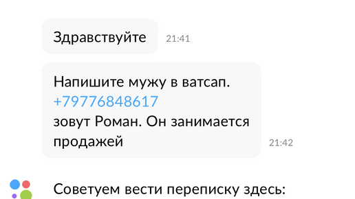 Схема классическая: из карточки товара вы попадаете в диалог с продавцом, где яко бы жена просит написать мужу в Вацап и даёт номер телефона. Вы пишете, он типа занят (усиливает важность), а дальше в обсуждении...