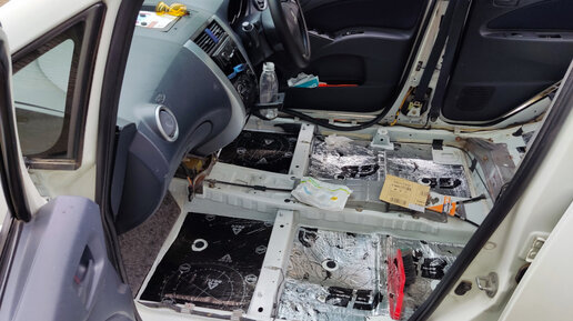 Пол передних седаков Выдался тёплый денёк. Больше +22. Можно (нужно) клеить виброизоляцию. К тому же, я всё уже подготовил ранее Спереди планировал оклеивать сплошь, а вот багажник по резонансным точкам. Клею на улице, грею солнышком.