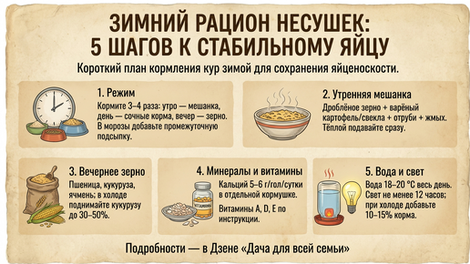Коротко по делу Зимой я держу простой режим: утро — тёплая мешанка, день — сочные корма и витаминная подкормка, вечер — сухая зерносмесь с кукурузой. Обязательные добавки для яйценоскости — кальций 5–6 г на голову, витамины A, D, E по инструкции и тёплая вода 18–20 °C. Если курятник не отапливается, норму корма увеличиваю на 10–15% и даю больше кукурузы (до 30–50% в смеси), чтобы птица не тратила яйца на отопление самой себя. Утро в курятнике — от ощущений к результату С утра, когда ещё скрипит...