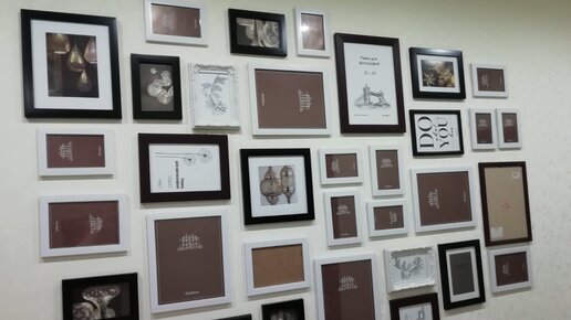 Давно мечтала оформить свободную стену в доме фоторамками. Но стены у нас железобетонные и просто так набить молоточком гвоздиков не получится, нужно сверлить дырки. Кто со мной давно на канале, возможно, вспомнит, что я делала рамки из картона, клеила их на двусторонний скотч, но нереализованная мечта в голове осталась. Рамки разных цветов и размеров я собирала на протяжении полугода. Затем стала думать, как лучше разместить их на стене, а главное - как не ошибиться с местами для просверливания дырок...