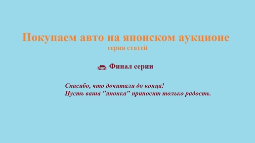 Спасибо, что прошли этот путь до конца. От первой ставки до первого километра – теперь вы знаете, как устроены японские аукционы, какие подводные камни могут встретиться и как не потеряться в бумагах и этапах. Если вы дочитали всё – вы уже не новичок. Вы человек, который понимает процесс и может принимать решения без страха, спокойно и с уверенностью. Казалось бы, просто машина. Но на самом деле – ваша настойчивость, аккуратность и вера в результат, превращённые в металл и колёса.