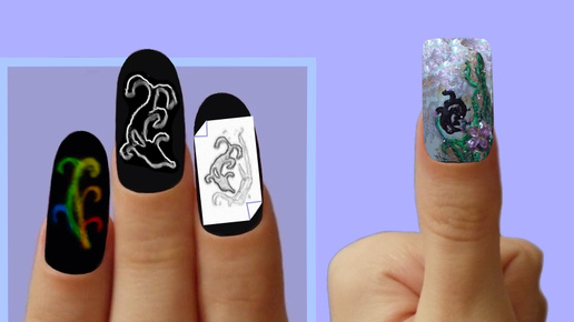 Здесь не нужны дорогие материалы, не нужна лампа для наращивания ногтей. Первого дельфина-татуировку я нарисовала на вырезанном из картонной коробки листе бесцветного пластика иголкой и чёрным лаком, добавила листья Коллаж. Ногтевой дизайн Дельфин Пять Линий растения зелёной и салатовой гелевыми ручками. Поиграла с лаками-хамелеонами, голубым перламутровым и золотым лаками на искусственном накладном ногте, приклеила цветок из пяти овальных страз среди листьев растений, нарисовала моего второго дельфина...