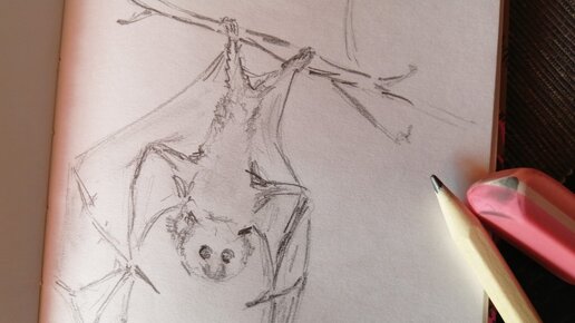 Как я уже недавно писала, завела себе блокнот, в котором делаю очень быстрые зарисовки. Сегодня мне захотелось нарисовать летучую мышь. До это прочитала статью о них, впечатлилась. Правило для рисунков в этом блокноте - уложиться в пять минут. Вот какая мыха у меня получилась: Знаю, знаю, на летучую мышь не очень похожа, но я только учусь. А зверьки эти очень интересные. Я вот и не знала, что всяких разных летающих мышек насчитывается около 700 видов! И три вида из них настоящие вампиры. А есть и вегетарианцы, которые любят полакомиться фруктам, ягодами, нектаром и орешками...