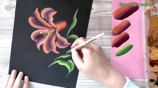 Приветствую вас! Меня зовут Ирина Лямшина. В этой статье я расскажу, как нарисовать оранжевую лилию плоскими кистями в технике One Stroke. Инструменты и материалы: - Темперные или акриловые краски; - Плоские кисти №8, №6; - Круглые кисти №1,№4; - Плотная тёмная бумага. Прелесть техники One Stroke заключается в одновременном использовании двух красок. Подробнее об этом декоративном приёме можно почитать тут. Свет и тень в лилии моделируются с помощью двух цветов: оранжевого и сиреневого хинакридона...