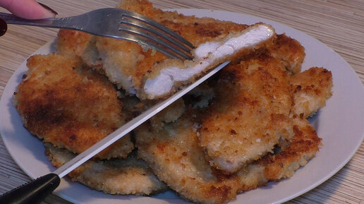 Друзья всем огромный привет. Сегодня я покажу как легко и быстро приготовить куриную грудку, пожарив её на сковороде. Грудка получается сочная внутри за счет панировки и очень быстро готовится. Берём филе грудки, я ее предварительно помыла и обсушила полотенцем. Нам её нужно разрезать пополам вдоль, чтобы кусочки были равной толщины. Проделываем всё то же самое с остальными грудками. Дальше нужно отбить молоточком с двух сторон через пакет, либо через плёнку. Помещаем нашу отбитую куриную грудку в глубокую миску и с остальными кусочками я проделаю то же самое...