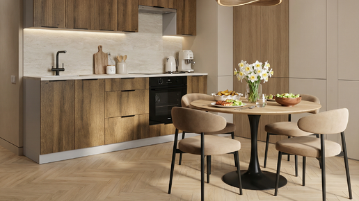 Чем больше вещей видно, тем тяжелее ощущение. Закрытые фасады работают лучше открытых полок, если вы не готовы поддерживать идеальный порядок...