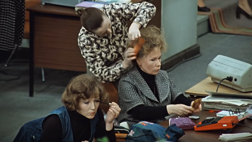 Любители советского кино наверняка помнят забавный эпизод из комедии Эльдара Рязанова «Служебный роман» о том, как начинается рабочий день в офисе статистического учреждения. И начинается он каждый раз одним и тем же образом. Женщины приходят из дома, садятся за свои рабочие столы и начинают усиленно... нет, не трудиться, а наводить марафет. Они: 1) красят глаза и губы; 2) наводят прически себе и офисным соседкам; 3) мажутся тональными и обычными кремами; 4) вытаскивают из сумочек цепочки с кольцами...