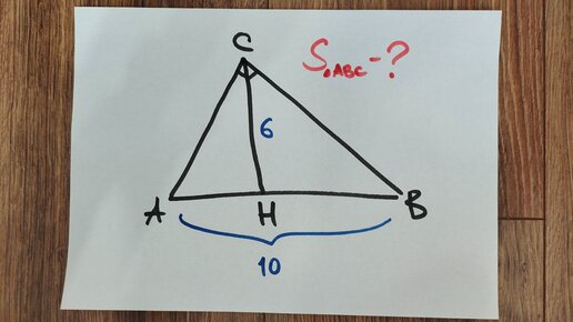 Вот задача. Вам дан прямоугольный треугольник. Из вершины прямого угла на гипотенузу длинной 10 опущена высота длинной 6. Надо найти площадь прямоугольного треугольника ABC.